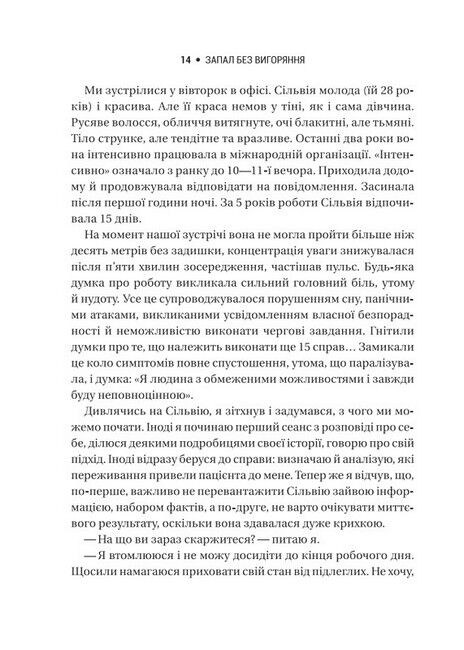 Існує хибна думка, що вигоряння — це «хвороба» лінивих і неуспішних людей. Натомість вигоряють керівники великих компаній, топменеджери, бізнесмени, лікарі, зірки світового масштабу. Виснажує надмір робочих обов’язків, які вони виконують упродовж ненормованого робочого дня. Як зрозуміти, що ви (ваші підлеглі) емоційно вигоріли? Чому нормально зраджувати начальникові надії та прохати про допомогу? Де шукати мотивації та щастя під час війни? Відповіді — на цих сторінках. А ваш піковий рівень стресостійкості та психологічного добробуту вже не за горами.