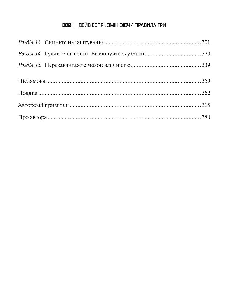 Прагнучи щось змінити у власному житті, ви можете дотримуватися перевіреного шляху та наслідувати стандартні приклади. Натомість автор цієї книжки пропонує орієнтуватися на тих, хто змінює правила гри, іде всупереч звичним методам та сміливо ризикує. Він опитав понад 450 людей, які змінили світ завдяки своїм відкриттям: науковців, що здійснили проривні дослідження, психологів, митців, бізнес-лідерів. Ці новатори й вам допоможуть бути у виграші: вони порадять, як позбутися страхів, перестати зациклюватися на негативному досвіді, мати здоровіший сон, вийти за межі шаблонів мислення, і запропонують ще безліч перевірених способів щодо того, як поліпшити самопочуття та продуктивність.