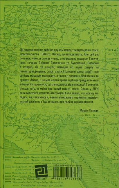 «Ця книжка вперше вийшла друком понад тридцять років тому, Орвеллівського 1984-го. Звісно, це випадковість. Але цей рік пояснює, чому я описав уявну, а не реальну подорож Галичиною, точніше Східною Галичиною й Буковиною. Подорож в історію, як то кажуть, пальцем по карті, оперту на літературні джерела, старі газети й історичні фотографії – все це було масивом матеріалу, з якого я черпав у бібліотеках та архівах. Звісно, я не мав нічого проти, щоб насправді поїхати в ті місця й подивитися, що залишилося від колишньої Галичини. Більше того, я мріяв про такий пошук слідів. Однак у 80-ті роки минулого століття австрійцеві було важко, а в моєму випадку, як з’ясувалося, навіть не-можливо отримати індивідуальний дозвіл на в’їзд до краю, про який я вирішив писати» (Мартін Поллак, із передмови до українського видання).
