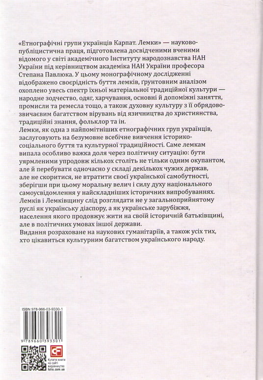 «Етнографічні групи українців Карпат. Лемки» — науково-публіцистична праця, підготовлена досвідченими вченими відомого у світі академічного Інституту народознавства НАН України під керівництвом академіка НАН України професора Степана Павлюка. У цьому монографічному дослідженні відображено своєрідність буття лемків, ґрунтовним аналізом охоплено увесь спектр їхньої матеріальної традиційної культури — народне зодчество, одяг, харчування, основні й допоміжні заняття, промисли та ремесла тощо, а також духовну культуру з її обрядово-звичаєвим багатством вірувань від язичництва до християнства, традиційні знання, фольклор та ін.
