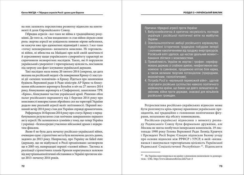 В історії України є місце перемогам та поразкам. Зараз ми живемо в той час, коли прогнозувати результат боротьби неймовірно складно, тому що йдеться не про відкритий конфлікт, а про нелінійну — «не визнану» — війну. Написана політичним експертом Євгенієм Магдою, книга «Гібридна агресія Росії. Уроки для Європи» допоможе читачеві зрозуміти суть конфлікту, його особливості і методи протидії агресорові.