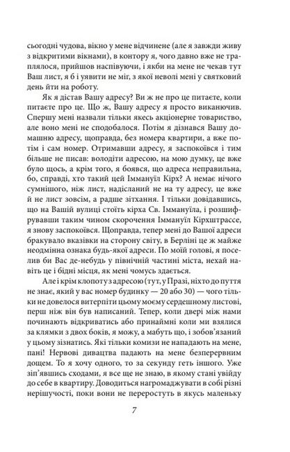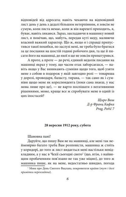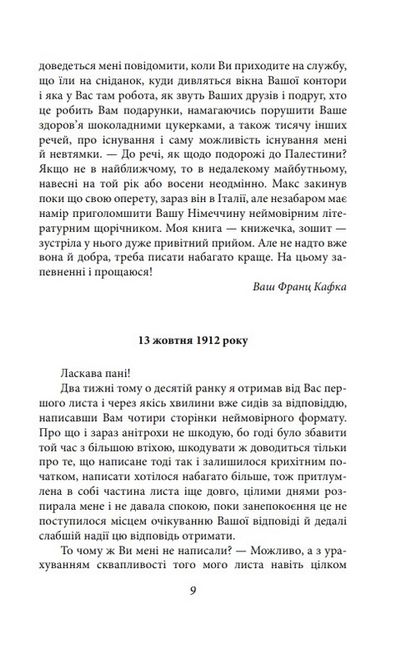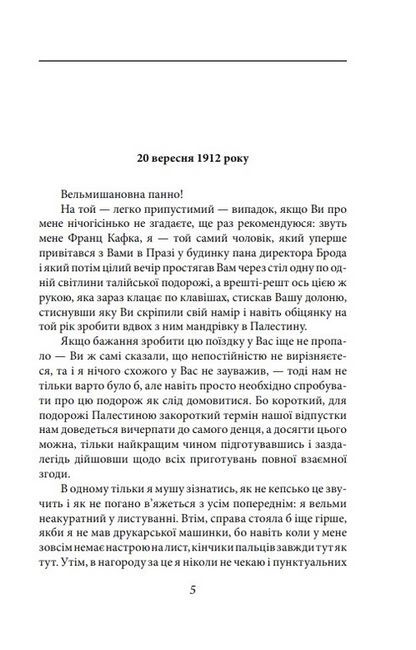 Листування Франца Кафки з його нареченою Феліцією Бауер тривало понад п’ять років — з 1912-го по 1917-й. Двічі Кафка робив їй пропозицію шлюбу і двічі вона погодилася. Родичі з обох сторін вважали весілля неминучим, а Кафка в цей час описував у щоденнику свої муки: він прагнув самотності й сумнівався в тому, що взагалі коли-небудь буде в змозі вступити в шлюб. У своїх листах до Феліції він писав в основному про себе, про свої муки, страхи та бажання. Мабуть, реальна Феліція Кафку не цікавила, його захопив придуманий образ, тінь жінки.