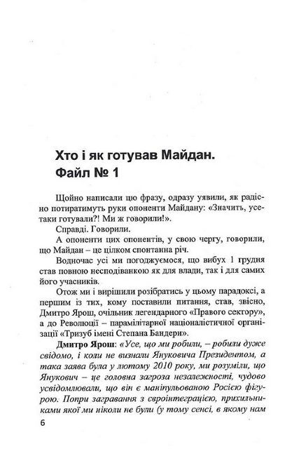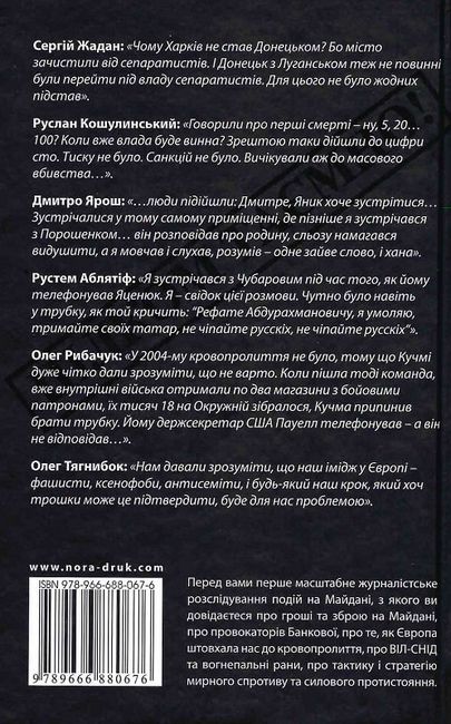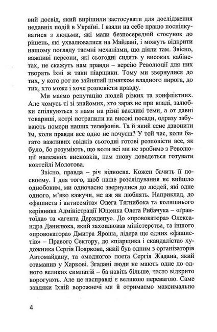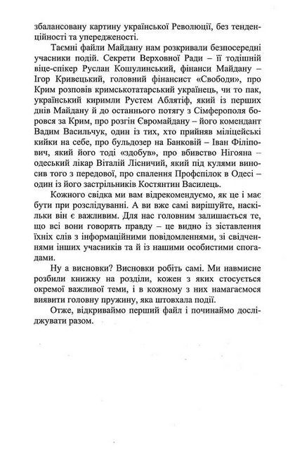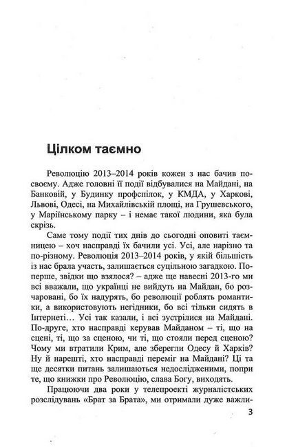 Герої цього журналістського розслідування не тільки ті, хто стояв на сцені, але й ті, хто ховався за лаштунками, хто їздив до Януковича і хто сперечався з Європою, захоплював адмінбудівлі, сидів у буцегарнях, а також воював, лікував, працював для того, щоб Революція перемогла.