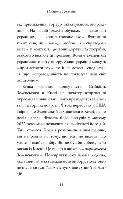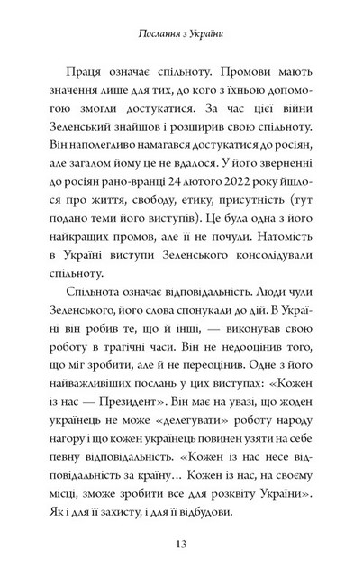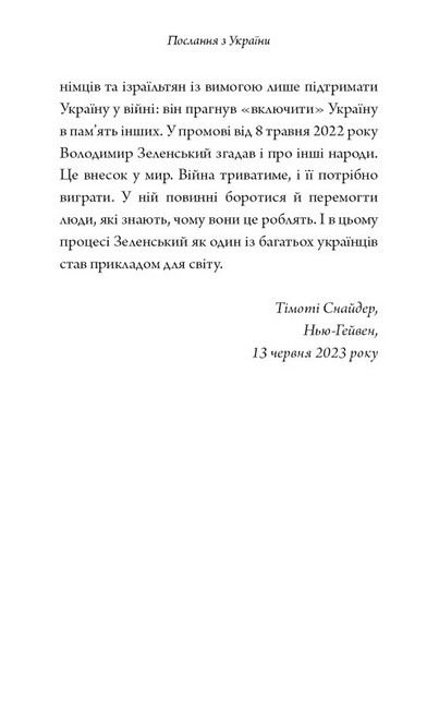 «Послання з України» — збірка промов Президента України Володимира Зеленського, які він особисто відібрав для цього видання. Вона містить ідеї, навколо яких зараз відбувається потужне єднання української нації. І саме ці звернення Президента вразили світ після повномасштабного вторгнення росії в Україну 24 лютого 2022 року. Багато висловів із цих промов стали крилатими й цитуються не лише в Україні, але й за кордоном. У них — сила правди. Вони загартовують наш дух. Українська історія, багата культура, споконвічна боротьба українців за свободу, мову, демократичні цінності стали для іноземців своєрідними відкриттями про Україну. У поданих спічах Президент порушує теми, близькі його адресатам: виступаючи в Кнесеті у Єрусалимі, він наголошує на байдужості світу до трагедії, яку пережив єврейський народ під час Другої світової війни, а виголошуючи промову перед членами Бундестагу, говорить про безглуздість стіни, що протягом 30 років ділила навпіл цілий народ посеред повоєнної Європи...