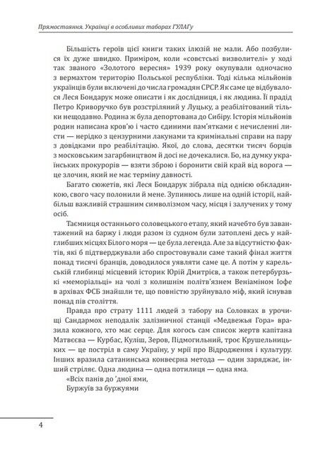 Про ув’язнення українців у таборах ГУЛАГу можна розповідати і писати нескінченно. Цю тему неможливо розкрити повністю в одній чи навіть у ста книжках. Завжди знайдуться нові цікаві документи, події, вражаючі долі людей. Підняті у цій книжці проблеми можна розвивати надалі окремими дослідженнями. І це треба робити. Бо чим більше ми шукаємо і працюємо, тим більше дізнаємося правди, яку тоталітарна система ретельно приховувала від нас. У цій праці розповідається, як українці боролися за право бути собою, потерпаючи від наруги в особливих радянських концтаборах (наджорстких умовах спеціально створених для політичних опонентів режиму).