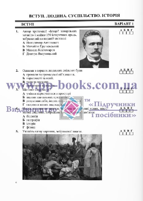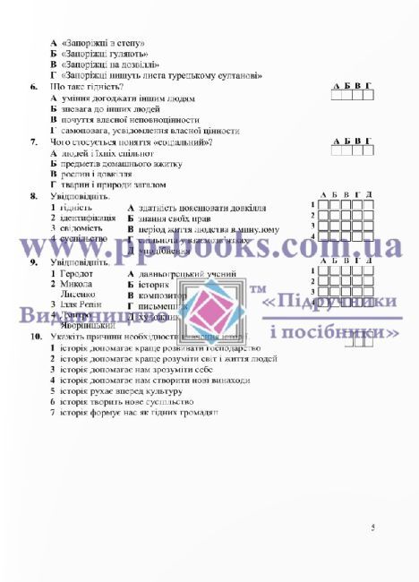 Посібник укладено до підручника інтегрованого курсу «Досліджуємо історію і суспільство» (авт. О. Пометун, Ю. Малієнко, Т. Ремех) для 5 класу закладів загальної середньої освіти, рекомендованого Міністерством освіти і науки України. Він містить тестові завдання різних типів, що охоплюють основний матеріал кожної з тем курсу. Використання завдань збірника допоможе учням у самостійній навчальній діяльності, а вчителям дасть можливість усебічно та об’єктивно контролювати рівень знань учнів, встановлюючи засвоєння не лише обсягу, а й глибини навчального матеріалу.