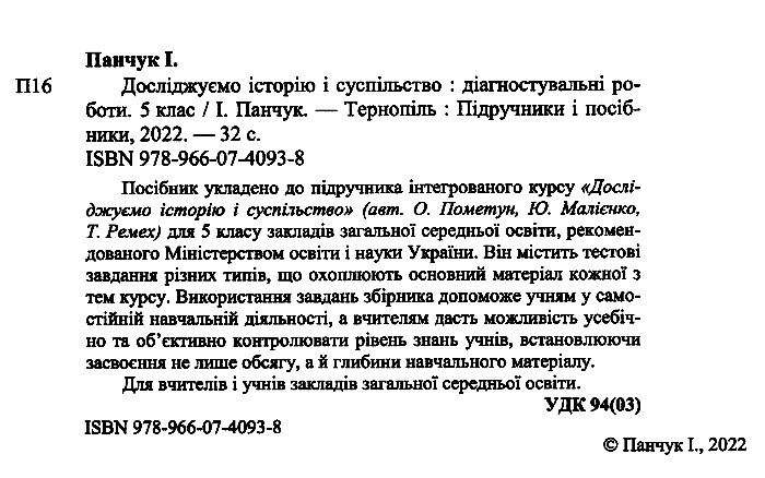 Діагностувальні роботи Досліджуємо історію і суспільство 5 клас НУШ До підручника О. Пометун та ін. Авт: Панчук І. Вид-во: Підручники і посібники 73420