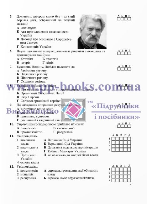 Посібник укладено до підручника інтегрованого курсу «Досліджуємо історію і суспільство» (авт. І. Васильків та ін.) для 5 класу закладів загальної середньої освіти, рекомендованого Міністерством освіти і науки України. Він містить тестові завдання різних типів, що охоплюють основний матеріал кожної з тем курсу. Використання завдань збірника допоможе учням у самостійній навчальній діяльності, а вчителям дасть можливість всебічно та об’єктивно контролювати рівень знань учнів, установлюючи засвоєння не лише обсягу, а й глибини навчального матеріалу.