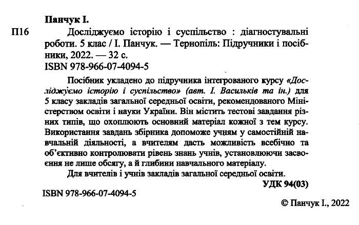 Діагностувальні роботи Досліджуємо історію і суспільство 5 клас НУШ До підручника І. Васильків та ін. Авт: Панчук І. Вид-во: Підручники і посібники 73419