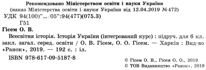Підручник Всесвітня історія Історія України 6 клас Нова програма Авт: Гісем О.В. Гісем О.О. Вид-во: Ранок 37213