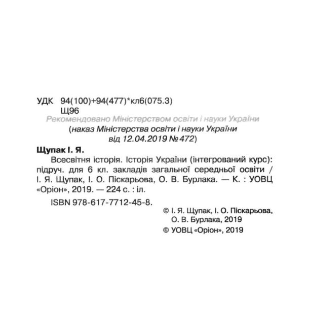 Всесвітня історія. Історія України 6 клас інтегрований курс І. Щупак, І. Піскарьова, О. Бурлака Оріон. У підручнику сполучається стародавня історія зарубіжних країн і предків українців слов'ян та інших народів, які жили до них на території сучасної України. Основний текст підручника складається з розділів, параграфів та окремих пунктів.