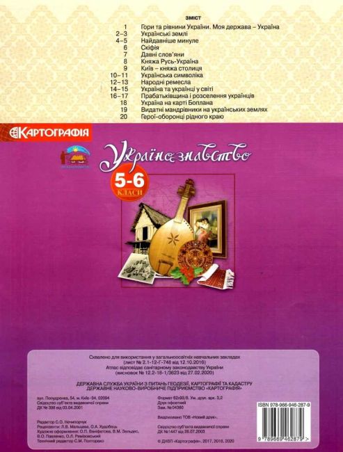 Атлас розроблено згідно з програмою «Українознавство. 5-11 класи», затвердженою Вченою радою Національного науково-дослідного інституту українознавства та всесвітньої історії Міністерства освіти і науки України. Матеріали були опрацьовані та адаптовані відповідно до вікових особливостей учнів середніх навчальних закладів. Метою і завданням атласу «Українознавство» є прив’язка до території головних понять змісту навчального матеріалу: природа та екологія, етнос, історія та культура, нація та держава, Україна і світ. Це обумовлює тематику атласу: рельєф України, українські землі, найдавніше минуле, Скіфія, давні слов’яни, Київська Русь і княжа столиця, народні ремесла. Крім того, розроблено кілька оригінальних карт, що на думку упорядників, мають поглибити у школярів розуміння предмету: карта «Українська символіка» (ст. 10-11), «Україна та українці у світі» (ст. 14-15), «Прабатьківщина і розселення українців» (ст. 16-17), «Видатні мандрівники на українських землях» (ст. 18-19, до цієї теми, згідно з програмою, додається репродукція карти Ґ. Боплана), «Герої-оборонці рідного краю». Формат атласу 22х28 см. Обсяг – 20 стор.