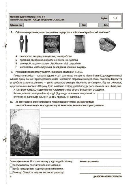 Завдання дібрано для всіх видів оцінювання, зокрема: бліцоцінювання, тестових, комбінованих діагностувальних робіт. Усі роботи розміщено на окремих аркушах зручного формату (за варіантами), наприкінці яких відведено місце для самооцінювання здобувачів освіти та коментаря вчителя.