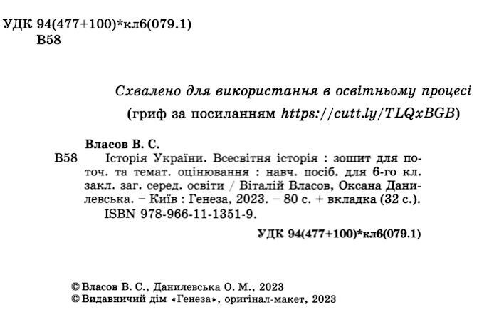 Зошит для поточного та тематичного оцінювання Історія України Всесвітня історія 6 клас НУШ Авт: Власов В.С. Данилевська О.М. Вид-во: Генеза 90681