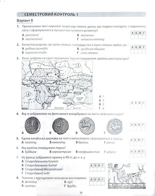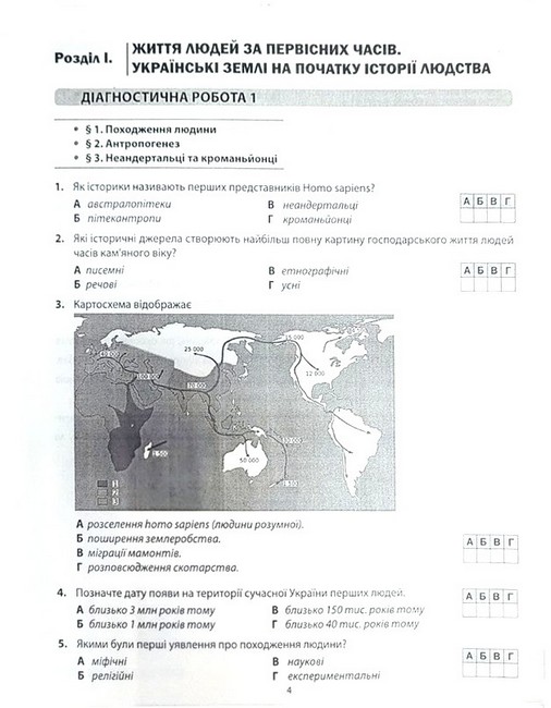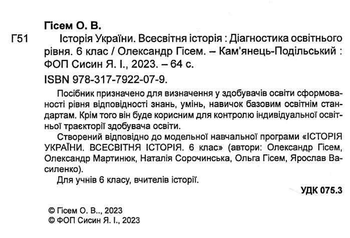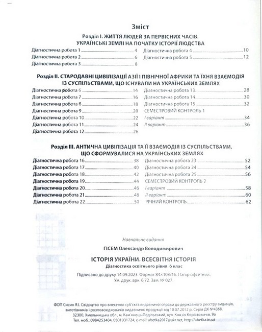 Посібник призначено для визначення у здобувачів освіти сформованості рівня відповідності знань, умінь, навичок базовим освітнім стандартам. Крім того він буде корисним для контролю індивідуальної освітньої траєкторії здобувача освіти. Створений відповідно до модельної навчальної програми «Історія України. Всесвітня історія. 6 клас» (автори: Олександр Гісем, Олександр Мартинюк, Наталія Сорочинська, Ольга Гісем, Ярослав Василенко).