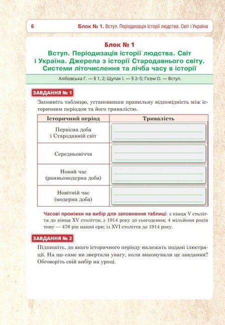 Зошит укладено відповідно до чинних модельних програм «Історія України. Всесвітня історія. 6 клас. НУШ» для загальноосвітніх навчальних закладів, затверджених наказом Міністерства освіти і науки України від 12.07.2021 № 795. Зміст завдань охоплює контекст одразу трьох підручників з історії, виданих 2023 року (авт. Гісем О., Гісем О., В’ятрович В.; Хлібовська Г., Крижановська М., Наумчук О.; Щупак І., Бурлака О., Власова Н., Піскарьова І.), що забезпечує вчителів та учнів потрібним матеріалом незалежно від того, яким саме підручником вони користуються. Зошит успішно пройшов апробацію.
