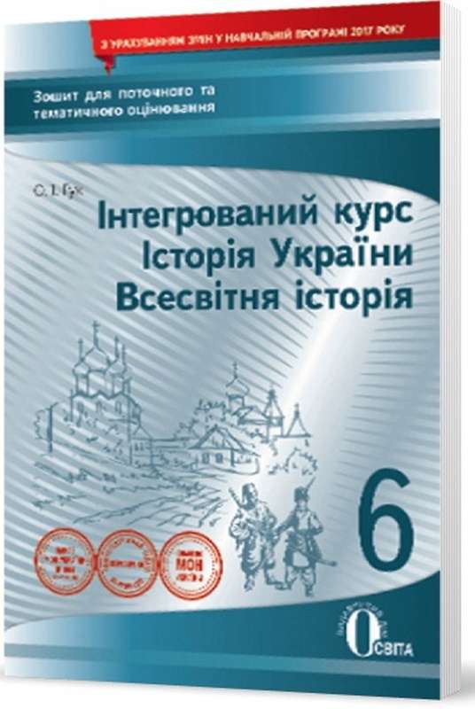 Зошит для поточного та тематичного оцінювання 6 клас Нова програма Інтегрований курс Історія України Всесвітня історія, містить завдання, які передбачають перевірку та оцінювання навчальних досягнень учнів, а на їх основі рівня сформованості основних базових і предметних компетентностей: хронологічної, просторової, інформаційної та логічної компетентностей. До кожної теми визначено обов'язкові результати навчання: вимоги до знань, умінь учнів, що виражаються у різних видах навчальної діяльності.