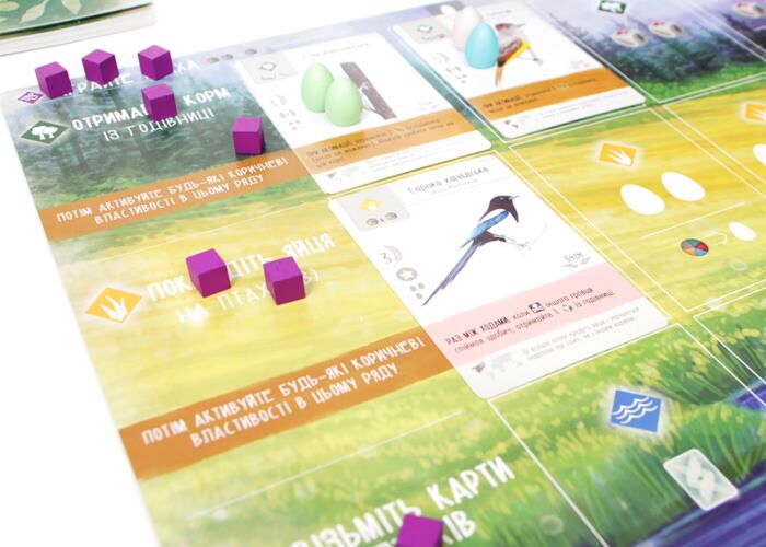 Ходы игроки совершают по очереди, тщательно планируя свои действия, особенно в момент активации карт, поскольку они повлияют на вашу дальнейшую стратегию. Учитывайте вид птичек и их природную среду обитания, какой корм они предпочитают, соседство с источниками и прочим.