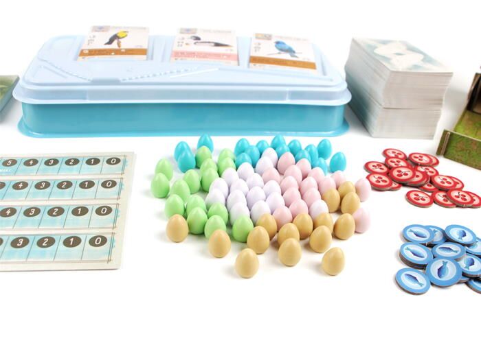 Кстати, о кормушках. Вам даже не нужно будет их выпиливать и выстругивать, потому что все компоненты настольной игры Крылья продуманы до мелочей. Башней для кубиков и по совместительству кормушкой стал самый настоящий скворечник, который уже повидал немало голодных птичек и слегка покрылся зелёненьким мхом. Очень атмосферно! Помимо такого привлекательного аксессуара в состав игры входит множество разноцветных яичек, жетончиков, кубиков, фишек, авиарий, заповедники и около 200 уникальных карт птиц. Каждый компонент сопровождают очаровательные иллюстрации и краски, а изображения птиц полностью реалистичны и дополнены кратким описанием каждой.