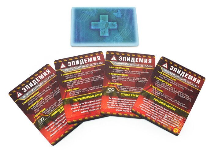 Теперь в игре появились три новых режима. Но это вовсе не хорошая новость, ведь каждый из них придает вашему сражению с болезнями сложности и опасности. В первом, вам предлагается заменить в колоде стандартные карты эпидемии на более смертоносные «вирулентные штаммы» – это хронические болезни, от которых крайне сложно избавиться. Второй режим прибавляет еще одну заразу к уже существующим. Она – результат мутации, из-за чего получается более быстротечной и сложной в лечении. Третий режим – самый сложный. Он добавляет в игру еще одного персонажа – биотеррориста. С ним появляется соперничество, ведь этот вредитель противостоит остальным игрокам, помогая заразе распространиться по всему миру.