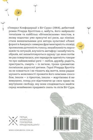 «Генерал Конфедерації з Біґ-Сура» (1964), дебютний роман Річарда Бротіґана є, мабуть, його найреалістичнішим та найбільш «бітниківським» текстом, в якому водночас уже присутні всі риси, що пізніше стали визначальними для автора культової «Ловлі форелі в Америці»: химерна фрагментарність оповіді, пронизлива дотепність голосу, нешаблонність персонажів та ситуацій, влучність метафор і незабутність образів, які запам’ятовуються одразу і до яких потім не раз повертаєшся, але передусім здатність говорити про найважливіші речі любов, дружбу, радість, пристрасть, смерть із легкою, трохи сумовитою посмішкою дорослої дитини. Герої Річарда Бротіґана не ховаються і не тікають від життя, вони радше шукають можливості прожити його власним способом, інколи з гіркотою, інколи жартівливо й невимушено, понад усе відстоюючи це своє право на внутрішню свободу, яку вони сподіваються знайти серед незайманих прадавніх скель та лісів Біґ-Сура.