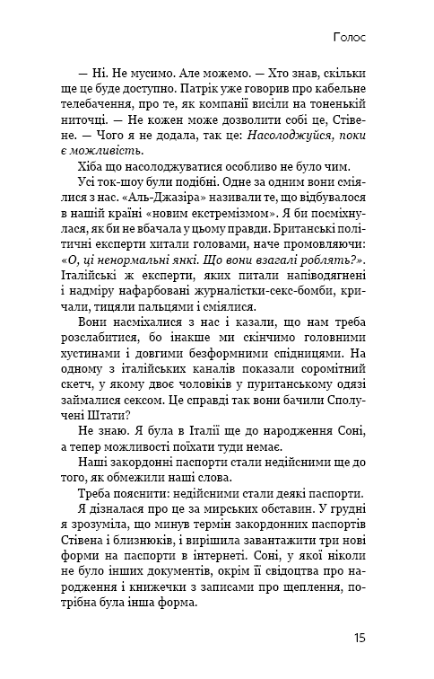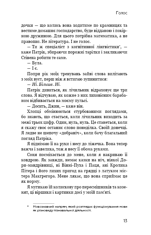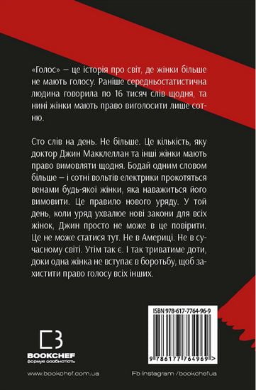 «Голос» — це історія про світ, де в жінок більше немає голосу. Раніше середньостатистична людина говорила по 16 тисяч слів щодня, та нині жінки мають право виголосити лише сотню. Сто слів на день. Не більше. Це кількість, яку доктор Джин Макклеллан та інші жінки мають право вимовляти щодня. Бодай одним словом більше — і сотні вольтів електрики прокотяться венами будь-якої жінки, яка наважиться його вимовити. Це правило нового уряду. У той день, коли уряд ухвалює нові закони для всіх жінок, Джин просто не може в це повірити. Це не може статися тут. Не в Америці. Не в сучасному світі. Утім так є. І так триватиме доти, доки одна жінка не вступає в боротьбу, щоб захистити право голосу всіх інших.