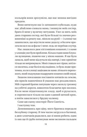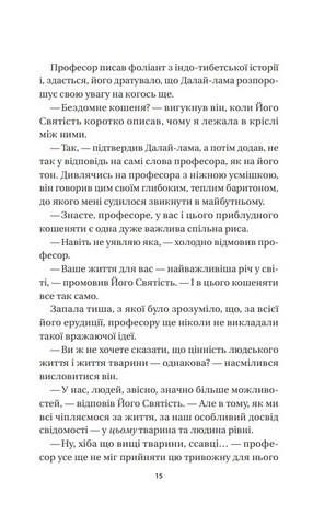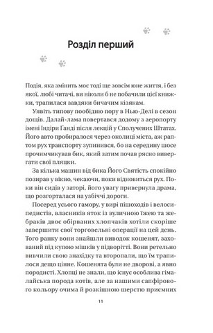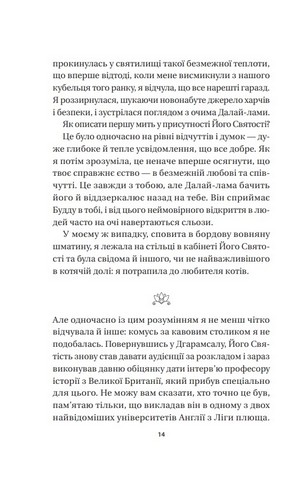 Колись я була кістлявим кошеням, яке загорнули в сторінку з газети тижневої давності і викинули на смітник. Але цю сцену спостеріг той самий Далай-лама… І відтоді я — Кішка Його Святості, живу в Джоканґу, пізнаю буддійські вчення. І якщо ви подумали, що зараз я спробую навернути вас у буддизм, то аж ніяк. Бо мета буддизму — дати знання, які допоможуть і католикам, і атеїстам, і котам стати щасливішими. Буду з вами відверта: духовно зростати нелегко, адже доводиться прощатися з упередженнями, дивитися в очі страхам і помилкам, визнавати зацикленість на собі, брати відповідальність за наслідки попередніх дій. На власні очі я бачила, як реальність руйнувала ретельно спроєктовану видимість всесвітньовідомих акторів, філантропів, митців, професорів із Ліги плюща, які приходили до Його Святості. Але й помітила, як інший погляд на звичні речі допомагав їм посправжньому зростати. Тож, хай де б ви жили й хай чого досягнули в житті, запрошую вас у мандрівку до свого щастя. І повірте, коти та люди мають значно більше спільного, ніж вам здається.