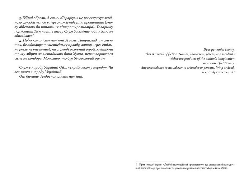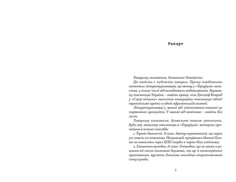 «Тераріум» починається як реалістичне, документальне свідчення про закритий світ: учорашній школяр опиняється раптом в академії спецслужби. Втім, із просуванням розповіді сильнішає підозра, що текст — про інше: деконструкцію міфів, дух епохи змін, втечу від реальності, психологію самотності та саморуйнування. Твір друкується вперше.