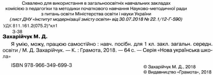 Навчальний посібник Я умію, можу, працюю самостійно 1 клас НУШ Авт: Захарійчук М.Д. Вид-во: Грамота 20179