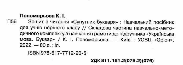 Зошит з читання Супутник букваря 1 клас НУШ Авт: Пономарьова К.І. Вид-во: Оріон 99359