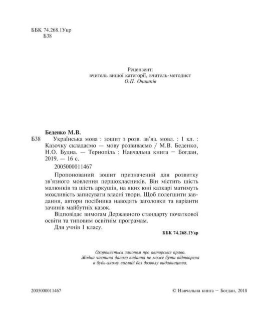 Зошит з розвитку зв'язного мовлення Українська мова Казочку складаємо-мову розвиваємо 1 клас НУШ Авт: Беденко М.В. Будна Н.О. Вид-во: Богдан 19986
