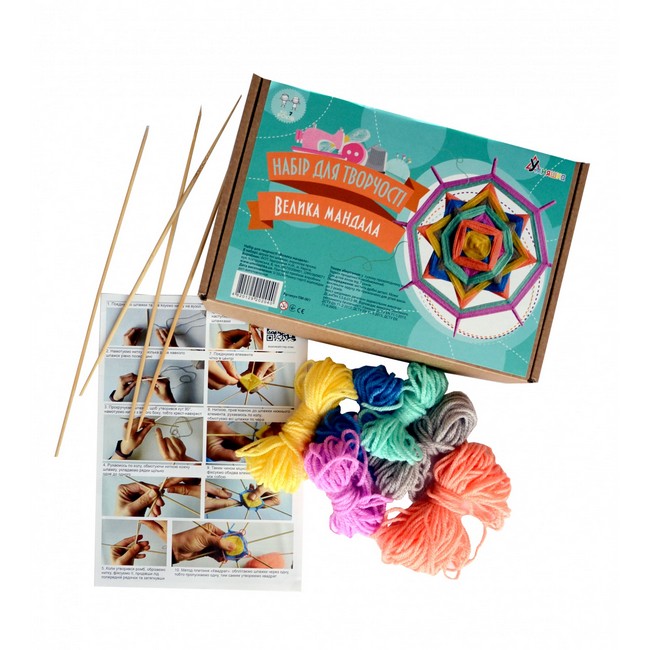 В наборі: кольорова пряжа 100% дитячий гіпоалергенний акрил, дерев'яні шпажки, інструкція Для дітей від 7 років.