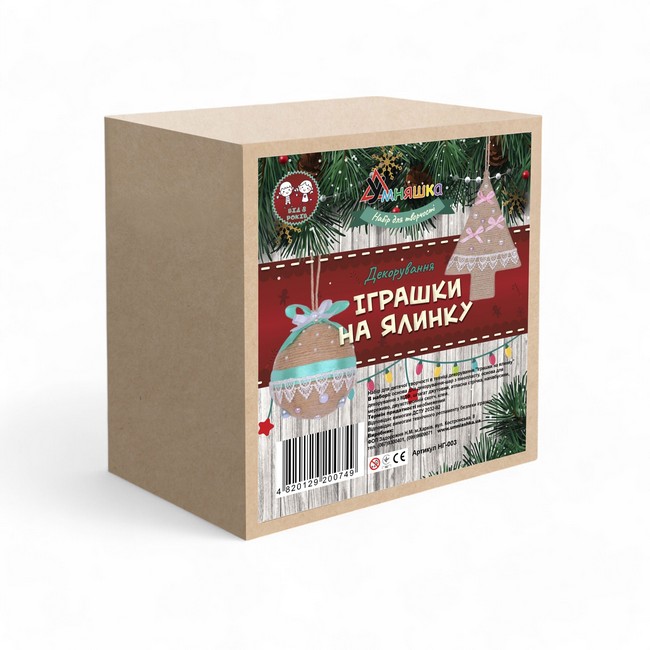 Розмір коробки ДхШхВ-113х102х125 мм. Розмір готового виробу: куля діаметром - 8 см, ялинка - 10х13 см.