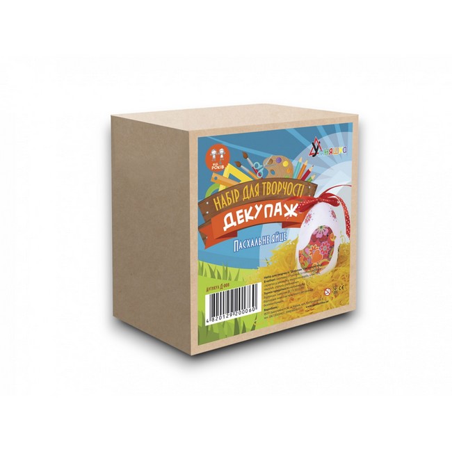 В наборі: заготовка з пінопласту-пасхальне яйце, серветка д/декупажу, акрилова фарба, клей ПВА, пензлик, стрічка, наповнювач Для дітей від 6 років.