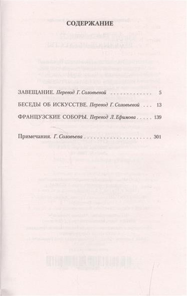 Бронзовые и мраморные создания великого французского скульптора Огюста Родена находятся в крупнейших мировых музеях, и даже далекие от искусства люди представляют, как выглядят «Мыслитель», «Поцелуй», «Вечная весна», «Граждане Кале». Однако мастер оставил нам не только скульптуры, но также интереснейшие литературные работы. В настоящем издании, кроме знаменитого «Завещания», представлены его «Беседы об искусстве» и «Французские соборы».