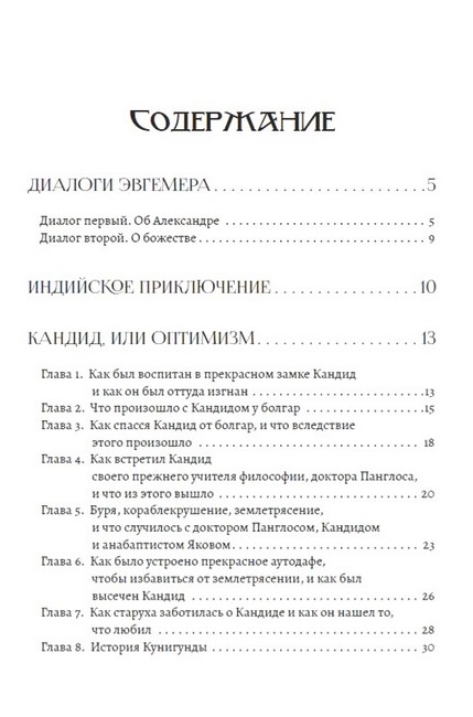 В издание сочинений Вольтера вошли такие известные его произведения, как философское сочинение «Диалоги Эвгемера», рассказ «Индийское приключение» и философская повесть «Кандид, или Оптимизм».
