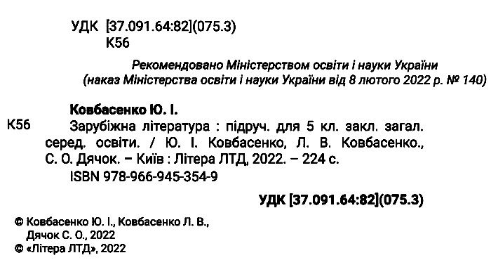 Підручник. Зарубіжна література. 5 клас НУШ Ковбасенко Ю. Літера