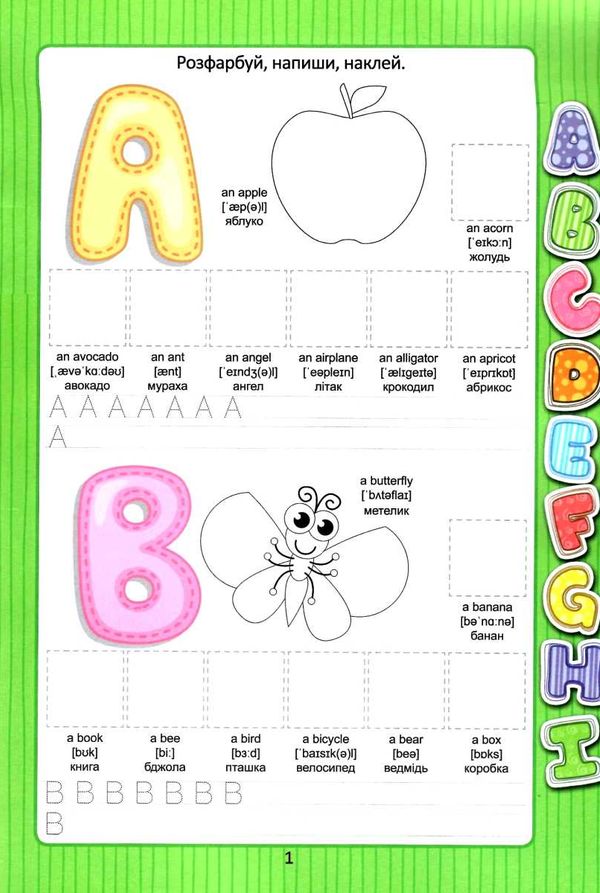 «Англійська абетка» — чудовий помічник для вивчення англійської. Вправи допоможуть вивчити літери англійської абетки, прості слова. Дитина потренується писати друковані літери за пунктиром, а за допомогою яскравих наліпок зможе виконати цікаві завдання. Такі вправи-тренажери ефективно готують руку до письма і дарують задоволення від навчання!