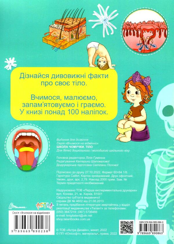 З цієї книги діти дізнаються дивовижні факти про своє тіло, розвинуть дрібну моторику, використовучи понад 100 кольорових наліпок. Всі завдання подано у формі гри.