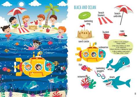 Дитячий майданчик, сонячний пляж, зоопарк, ферма, магазин, вулиця, дитяча кімната, пори року - теми, до яких можна поповнити словниковий запас з англійської мови за допомогою цієї книжки. А цікаві завдання для розвитку уваги, логічного мислення, розвитку мовлення та ін. допоможуть зробити дозвілля дитини ще й корисним.