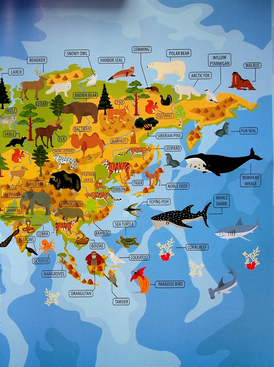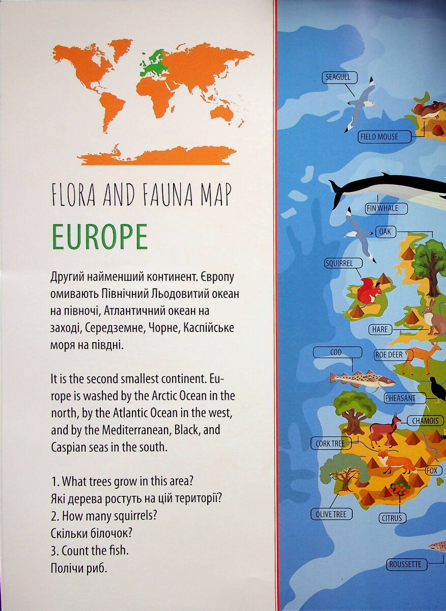 Трохи географії малечі не завадить! Так, ця книжечка познайомить дитину з континентами та різноманітними представниками тваринного й рослинного світу. А ще книга дає чудову можливість поповнити словниковий запас з англійської мови, закріпити навички лічби, потренувати увагу та логіку.