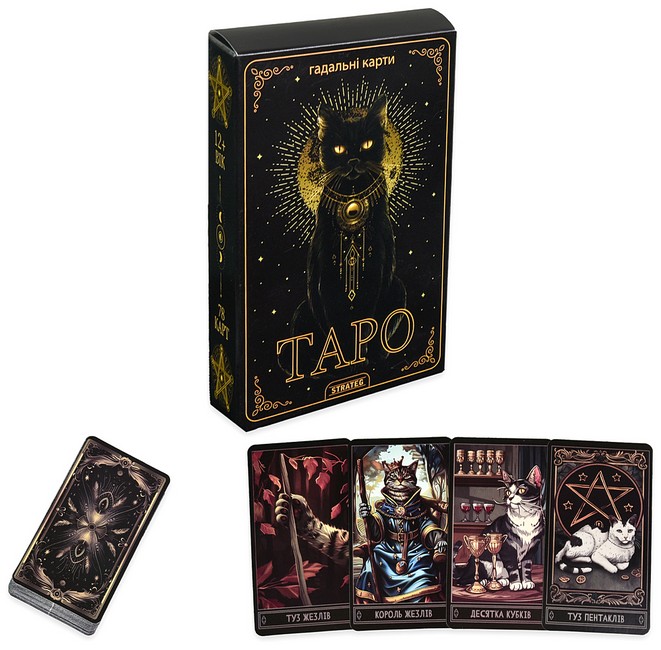 Карти «Таро» — це набір карт для тих, хто хоче краще відчути себе, прислухатися до інтуїції та заглянути глибше у щоденні питання. У цій колоді – образи котів, які поєднують мудрість, спокій і трохи магії. Кожна карта має власне послання, що допоможе побачити ситуацію під іншим кутом або знайти новий життєвий напрямок.