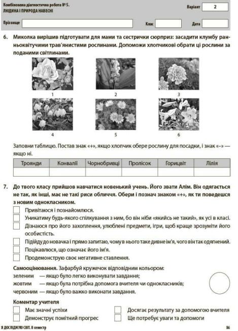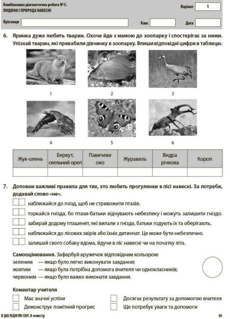 Передбачено місце для самооцінювання учня та коментаря вчителя.