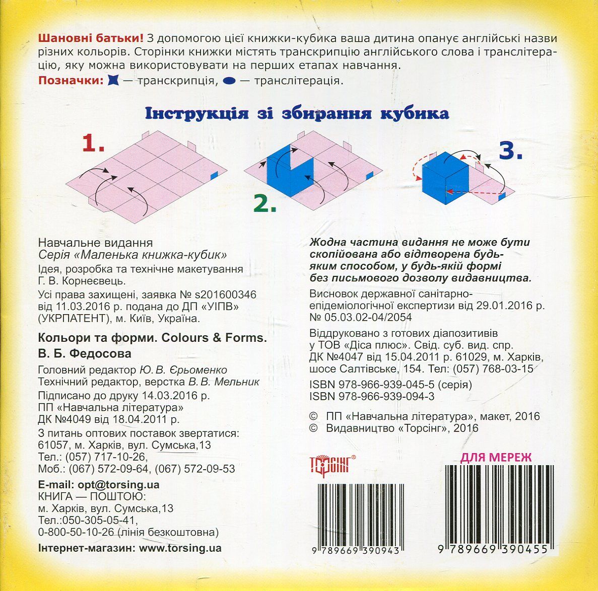 Шановні батьки! З допомогою цієї книжки-кубика ваша дитина швидко опанує цифри від 1 до 10 і зробить спробу рахувати предмети англійською мовою. Пам'ятайте, це лише перші кроки на шляху знань. Сторінки книжки містять транскрипцію англійської назви цифри і транслітерацію, що можна використовувати на перших етапах навчання