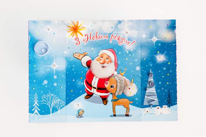 Набір містить: лист Санта-Клаусу, двобічну кольорову листівку з привітанням, покрокову інструкцію, смужки паперу, вовну для валяння, клейкі стрази, паєтки, бісер, джгут, клей ПВА.