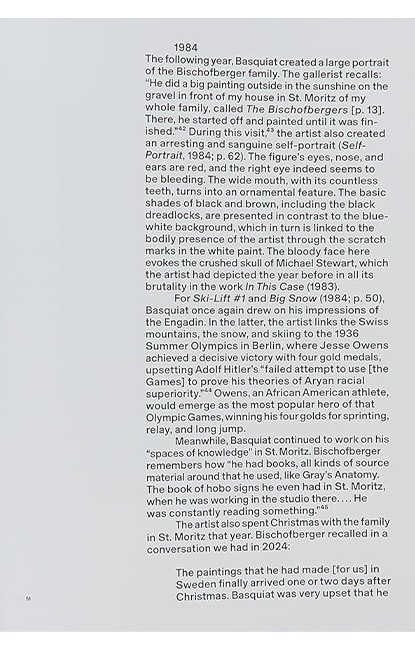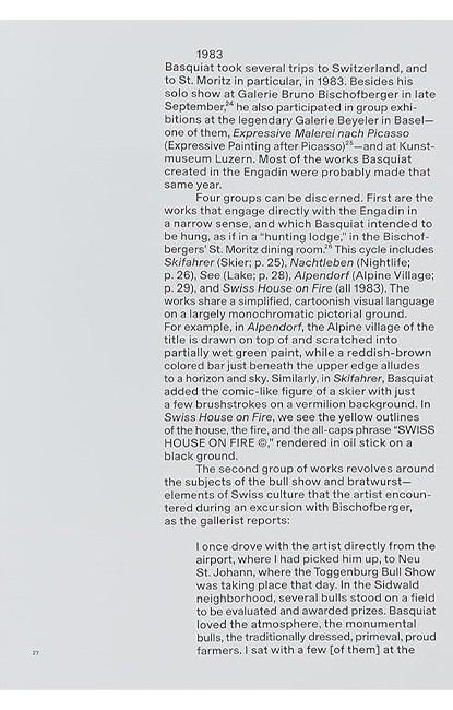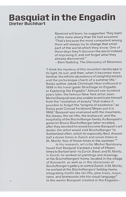 Хоча Жан-Мішель Баскія (1960–1988) асоціюється насамперед із Нью-Йорком, його мистецькі зв’язки охоплювали й інші куточки світу. Видання Jean-Michel Basquiat: Engadin простежує взаємини митця зі Швейцарією, які розпочалися у 1982 році після його першої виставки в галереї Бруно Бішофбергера в Цюриху. Саме Бішофбергер познайомив Баскію з Франческо Клементе — разом із Енді Ворголом вони сформували творчий тандем, що згодом перетворився у тісне партнерство між Ворголом і Баскією.
