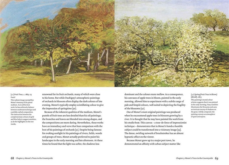 Книга складається з п'яти основних розділів, кожен з яких присвячений окремій темі: Ранні малюнки та картини Моне з деревами; його атмосферне використання річок та берегових ліній від Англії до Італії; поля, фермерські угіддя та сади Франції; парки та сади як у місті, так і в сільській місцевості; та його приглушені зображення дерев узимку. Вступне слово Скіа об'єднує ці теми, розглядаючи їх у контексті творчості Моне в цілому та простежуючи його мистецький розвиток. 84 ілюстрації.
