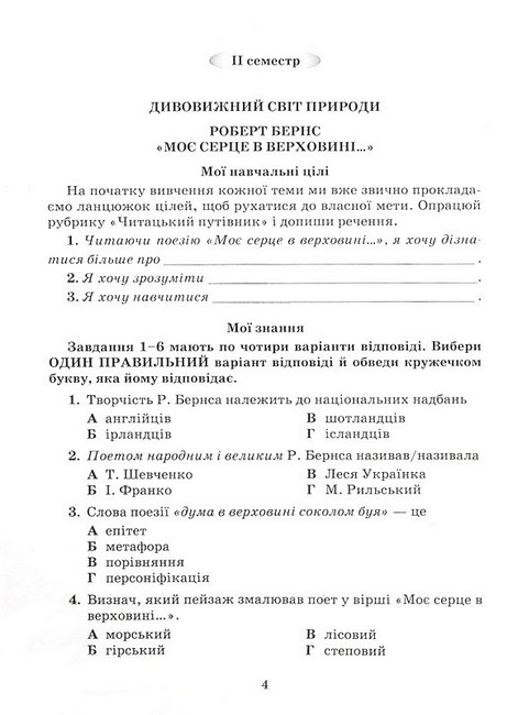 У виданні запропоновано визначення індивідуальних навчальних цілей, подано різнорівневі запитання та завдання в тестовій формі (закритого й відкритого типів), творчі завдання, семестрові діагностувальні роботи, рекомендовано завдання на рефлексію, передбачено проведення самооцінювання і взаємооцінювання навчальних досягнень учнів та учениць.
