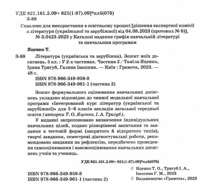 Зошит моїх досягнень Література українська та зарубіжна 5 клас Частина 2 НУШ Авт: Т. Яценко І. Тригуб Г. Івашина Вид-во: Грамота 93308