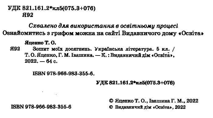 Зошит моїх досягнень Українська література 5 клас НУШ Авт: Яценко Т. Івашина Г. Вид-во: Освіта 73155